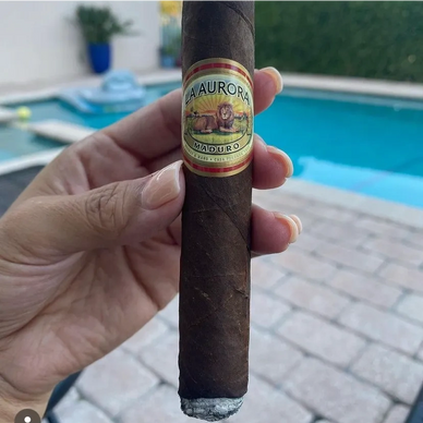 The La Aurora Maduro is a full-strength cigar that is hand rolled in the Dominican Republic. Its dark, oily Brazilian maduro wrapper covers a Nicaraguan binder and filler. The La Aurora Maduro has an earthy flavor with hints of pepper, nuts, coffee, and cream.